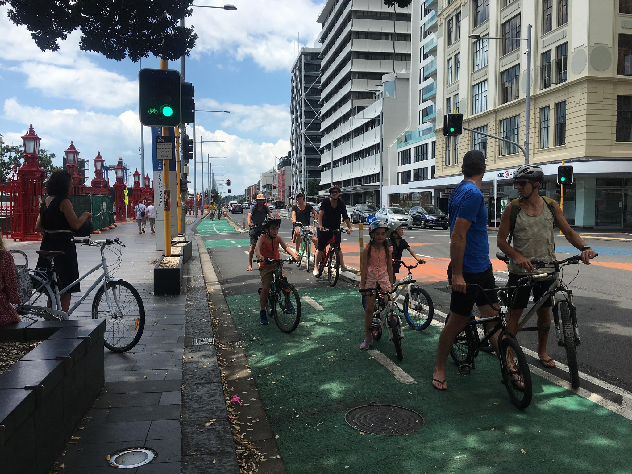 The network effect of connected, safe separated cycleway is having results by attracted new riders with a 7.9 % annual increase in 2017 (as reported in AT’s monthly report). For the first time, on Waitangi Day, the Quay Street cycleway counter hit over 2000 trips. (Photo right: Quay St on anniversary weekend)