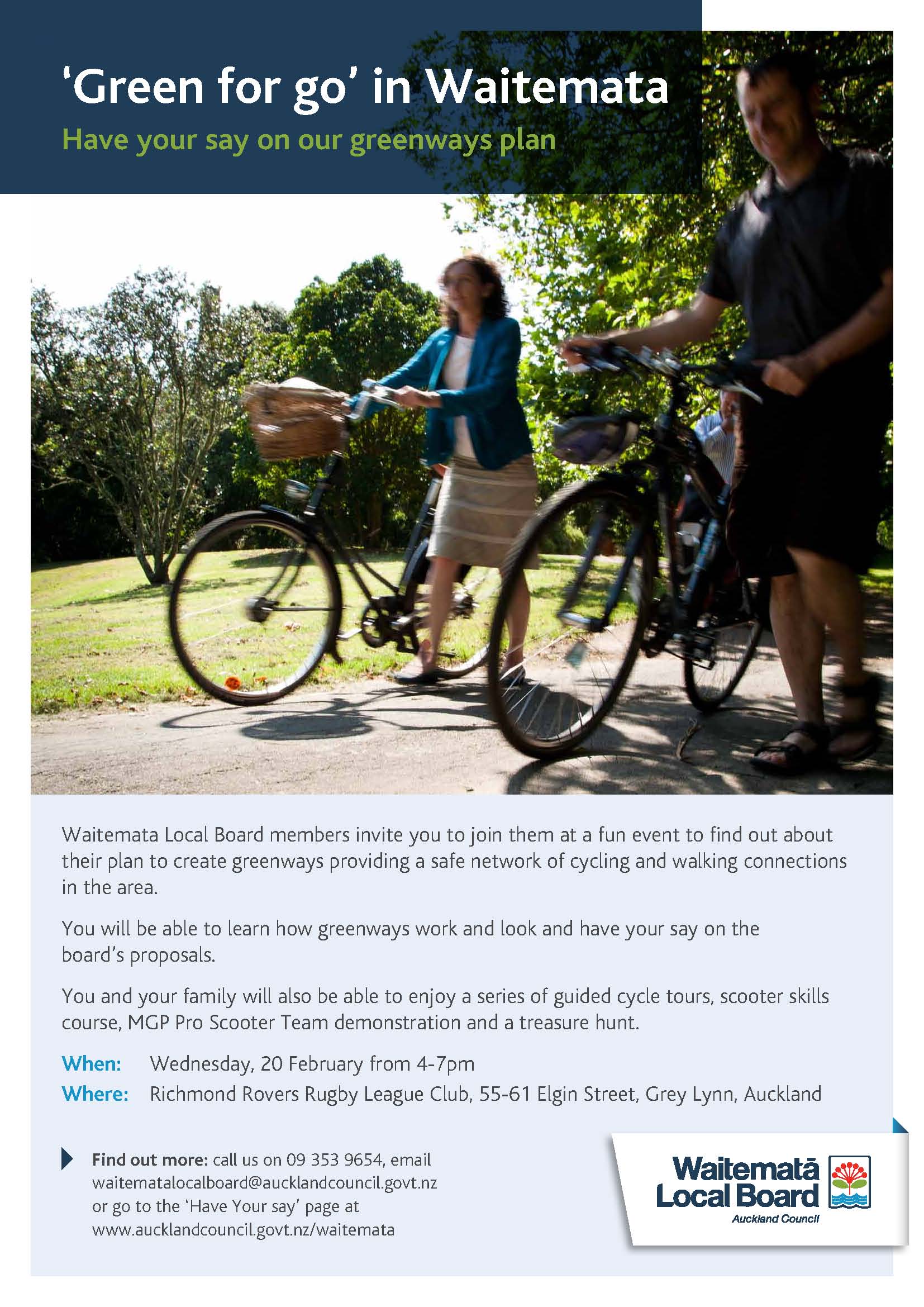 In January I assisted Shyrel Burt in finalised a consultation plan for our Greenways project. The project featured in Our Auckland and in the Board’s advertorial in February. A Greenways event is planned for 20 February from 4- 7pm at the Richmond Rovers Clubrooms in Grey Lynn Park.