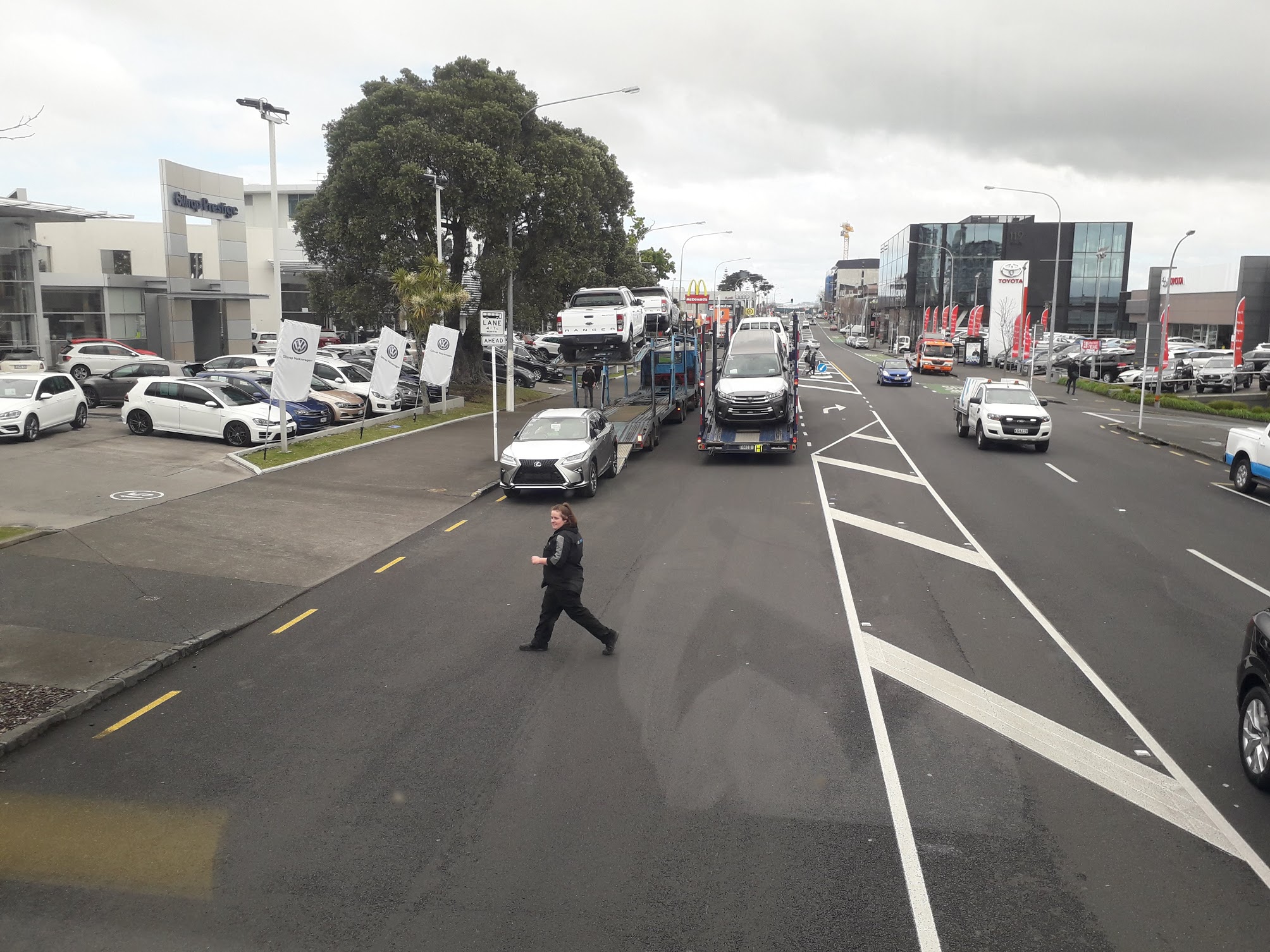 For a frustratingly long time I have been following up with Auckland Transport on the issue of car transporters unloading illegally on Great North Road.  There is a serious concern about public safety as the car transporters are blocking bus stops and the pedestrian refuge.