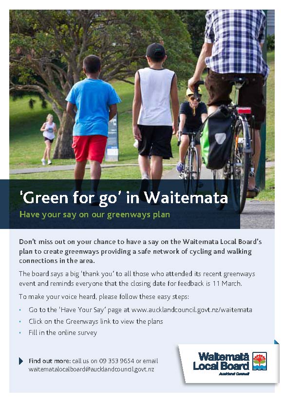 • Greenways event at the Richmond Rovers Clubroom, Grey Lynn park on 19 February