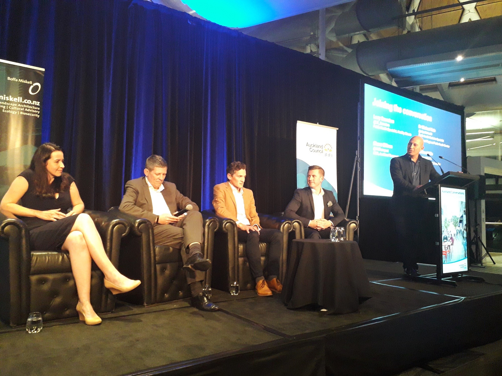 Morning tea with Grey Lynn library staff on 2 August (photo bottom)- Auckland Conversations – Healthy Streets for Auckland presentation by Lucy Saunders and panel discussion at the Viaduct Events Centre on 2 August (photo right)