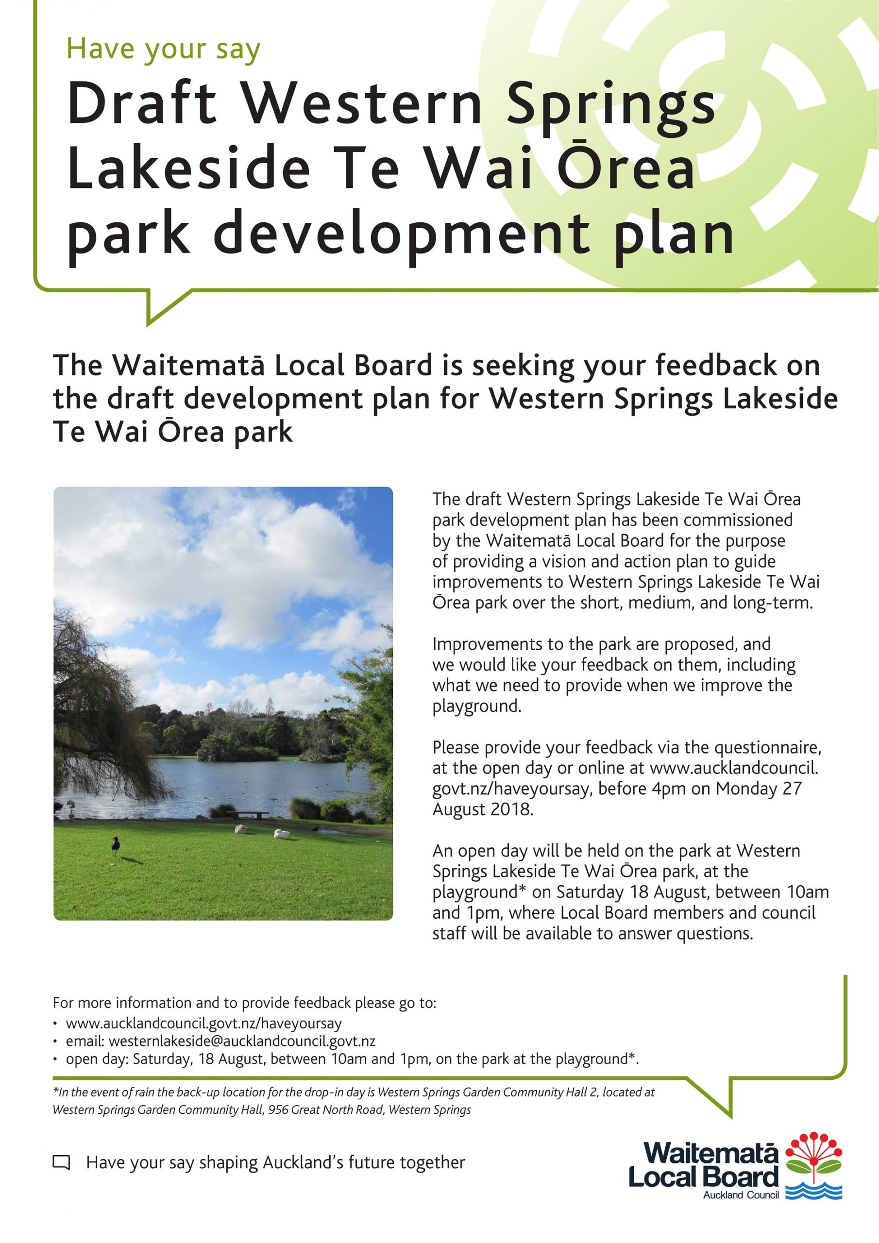 A draft park development plan for Western Springs Te Wai Ōrea Lakeside Park has been released for public feedback.