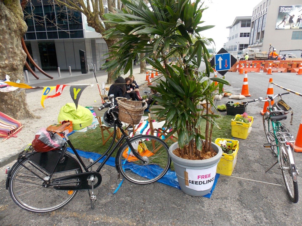 At the same time park(ing) day was being celebrated in Auckland with an installation (photos from 2009 and 2013) organised by Frocks on Bikes and Heart of the City. It was small beginnings to capture the potential of using an on- street car parks for people space – a project first begun in San Francisco in 2005 .